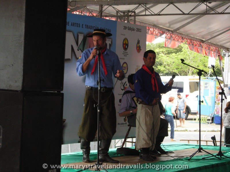 There was a good bit of variety in the costumes. The man on the left has over his shoulder the traditional case for the chimarrao kit. Inside would be the cup, the thermos and the herbs.