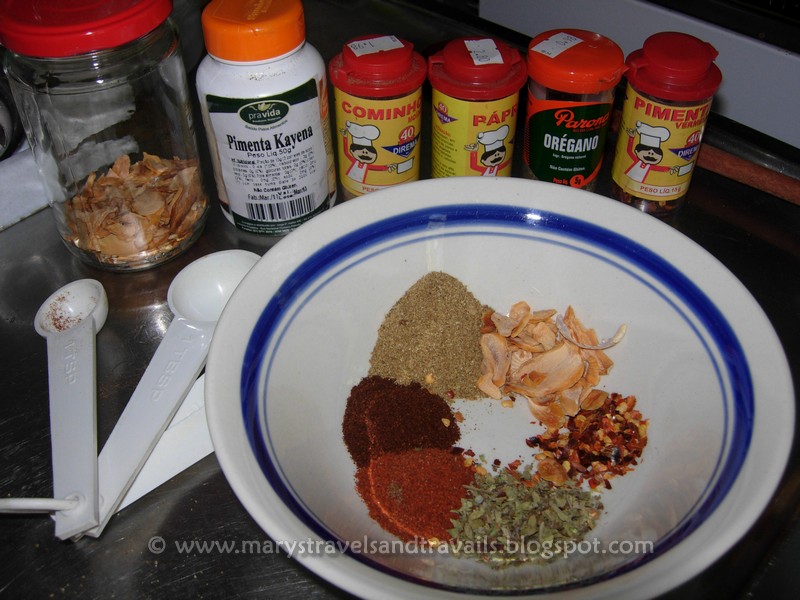 The spices: paprika, cumin, cayenne, oregano, garlic and crushed red pepper.